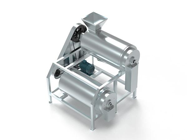 電機(jī)通過三角帶傳動,使安裝在花鍵軸上的刮板高速旋轉(zhuǎn),當(dāng)經(jīng)過破碎的水果通過進(jìn)料口進(jìn)入機(jī)內(nèi)時,擋漿盤將物料均勻排發(fā)到刮板和篩網(wǎng)之間,由于刮板的回轉(zhuǎn)作用和導(dǎo)程角的存在,使物料沿著園筒向出口端移動,移動的軌跡呈螺旋狀,物料就在刮板和篩網(wǎng)之間移動過程中受離心力的作用而被擦碎,汁液和肉質(zhì)(已成漿狀)從篩孔通過進(jìn)入下道工序(雙道打漿機(jī)為聯(lián)動重復(fù)上列過程),皮和籽等則從出渣斗排出,從而達(dá)到自動分離的目的。只要變換不同規(guī)格的篩網(wǎng)以及調(diào)整刮板導(dǎo)程角的大小,可改變不同的打漿速度,獲滿意的效果。