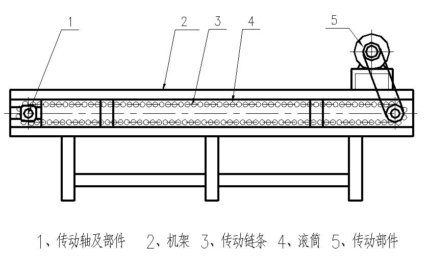該機(jī)由機(jī)架、滾筒(不銹鋼管φ51×1.5兩頭用工程塑料密封)、廢果輸送裝置、電機(jī)、傳動(dòng)系統(tǒng)、拉緊裝置等組成。