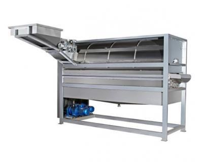 結(jié)構(gòu)特征及工作原理:該機主要有對壓輥三根、進料斗、出汁斗、出皮斗、機架、傳動等部分組成。工作時接通電源,將物料倒入進料斗中,物料首先經(jīng)過第一和第二根壓輥的對壓擠破,然后進入第一和第三壓輥進行榨汁,皮從出皮斗排出,汁和部分肉從出汁斗排出,從而達到榨汁的目的;該設(shè)備除傳動部位外其余均為不銹鋼制作。