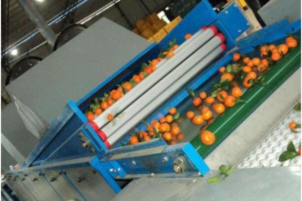 第三步,傳送帶帶到下一步水輪選果,通過鋼管之間的縫隙挑選,果小的會提早掉下去被篩掉,大的留到后被送上制品傳送帶,通過這一流程,果品被均勻分隔,一起,外表做了冷卻,相對延長了保鮮期。